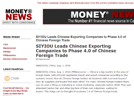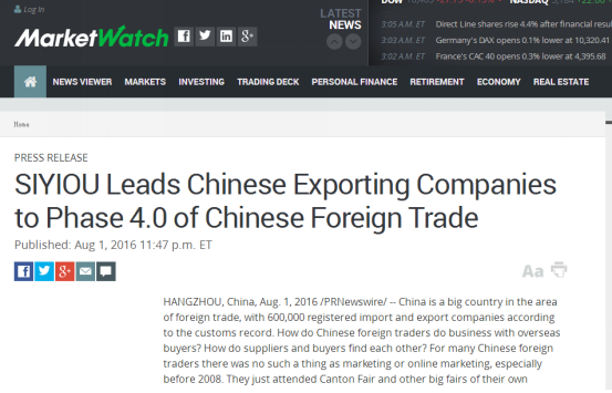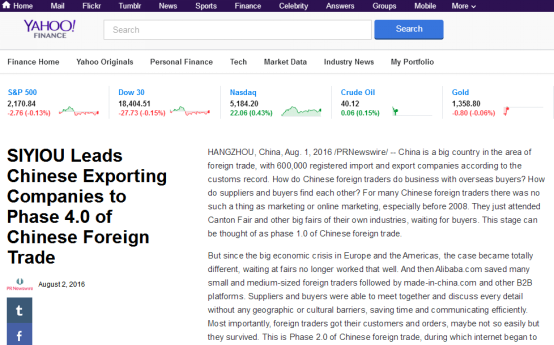 北京時(shí)間8月2日下午,美國198家知名財(cái)經(jīng)媒體,包括YAHOO FINANCE(雅虎財(cái)經(jīng))、CNBC(美國廣播公司財(cái)經(jīng)頻道)、Market Watch、Money News、Business Journal、Wall Street Select等,同步發(fā)布了題為SIYIOU Leads Chinese Exporting Companies to Phase 4.0 of Chinese Foreign Trade(思億歐引領(lǐng)中國出口企業(yè)進(jìn)入中國外貿(mào)4.0時(shí)代)的報(bào)道。