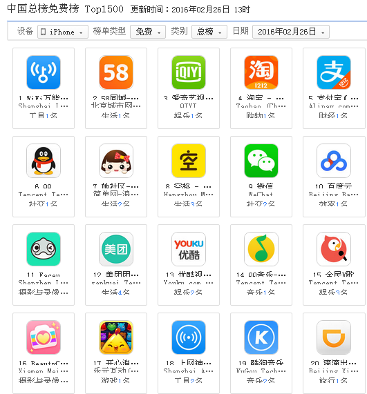 品牌詞:有的開發(fā)者說品牌詞最簡單了,不就一個名字嗎。其實不是這樣的,如果不是有強大的自信,品牌詞我還是建議抱抱大腿,如一款全民開店的APP,如果要抱微信的大腿,它的名字就可以叫微小店、微店等,而副標(biāo)題則可以直接用微信開店真方便,或手機開店真方便。當(dāng)然,不同性質(zhì)人的APP選擇的大腿對像當(dāng)然也不一樣,這時候我們打開ASO114,查看中國區(qū)總榜免費榜Top1500名的APP,總有一款大腿適合你。